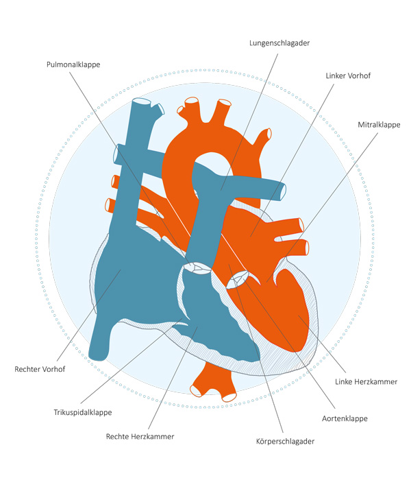 Sauerstoffarmes Blut fließt vom Körper durch die Venen ins Herz, genauer gesagt in den rechten Vorhof. Von dort gelangt es durch die Herzklappe – hier die Trikuspidalklappe – in die rechte Herzkammer. Nun wird das Blut durch die nächste Klappe – die Pulmonalklappe – durch die Lungenarterie in die Lunge gepumpt. Dort wird es mit Sauerstoff angereichert. Das nun sauerstoffreiche Blut fließt durch die Lungenvenen wieder hinein ins Herz und zwar in den linken Vorhof und dann durch die Mitralklappe in die linke Herzkammer. Anschließend pumpt es das Herz durch die Aortenklappe und die Aorta, von wo es in den gesamten Blutkreislauf des Körpers fließt und so den Körper mit sauerstoffreichem Blut versorgt.
