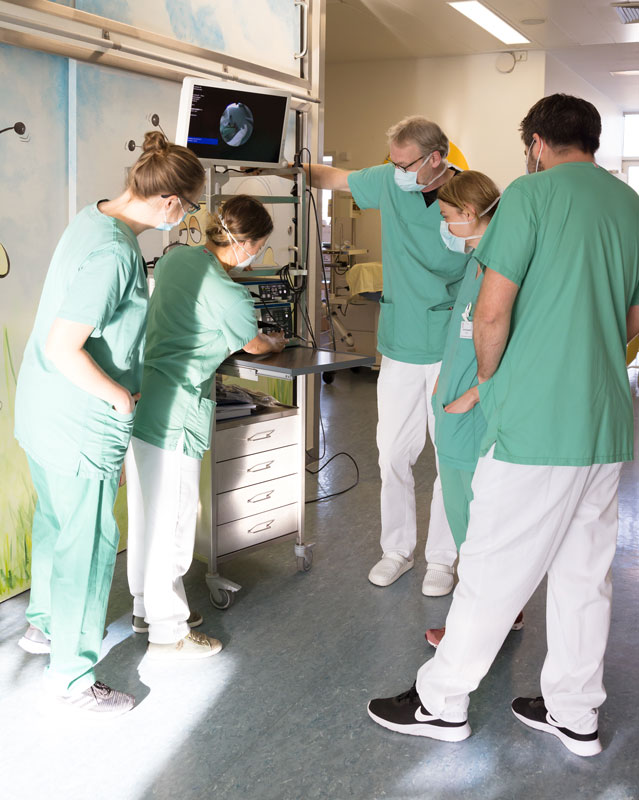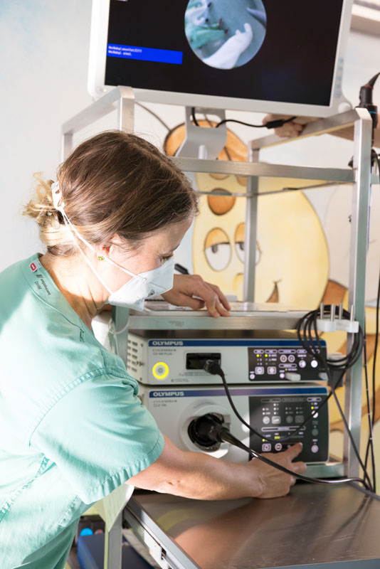Es gibt kleine Herzpatienten, deren zarte Anatomie eine Intubation mit einem flexiblen Bronchoskop notwendig macht. Am Bronchoskop ist eine kleine Kamera befestigt, deren Aufnahmen einen späteren Austausch mit anderen Kliniken und Kollegen ermöglichen.